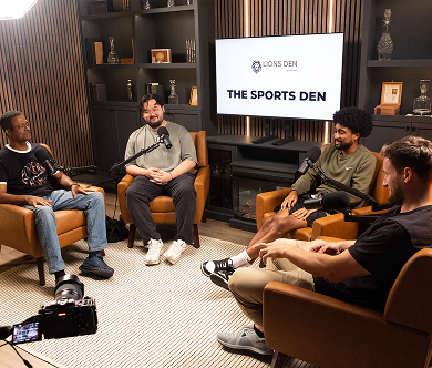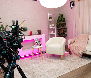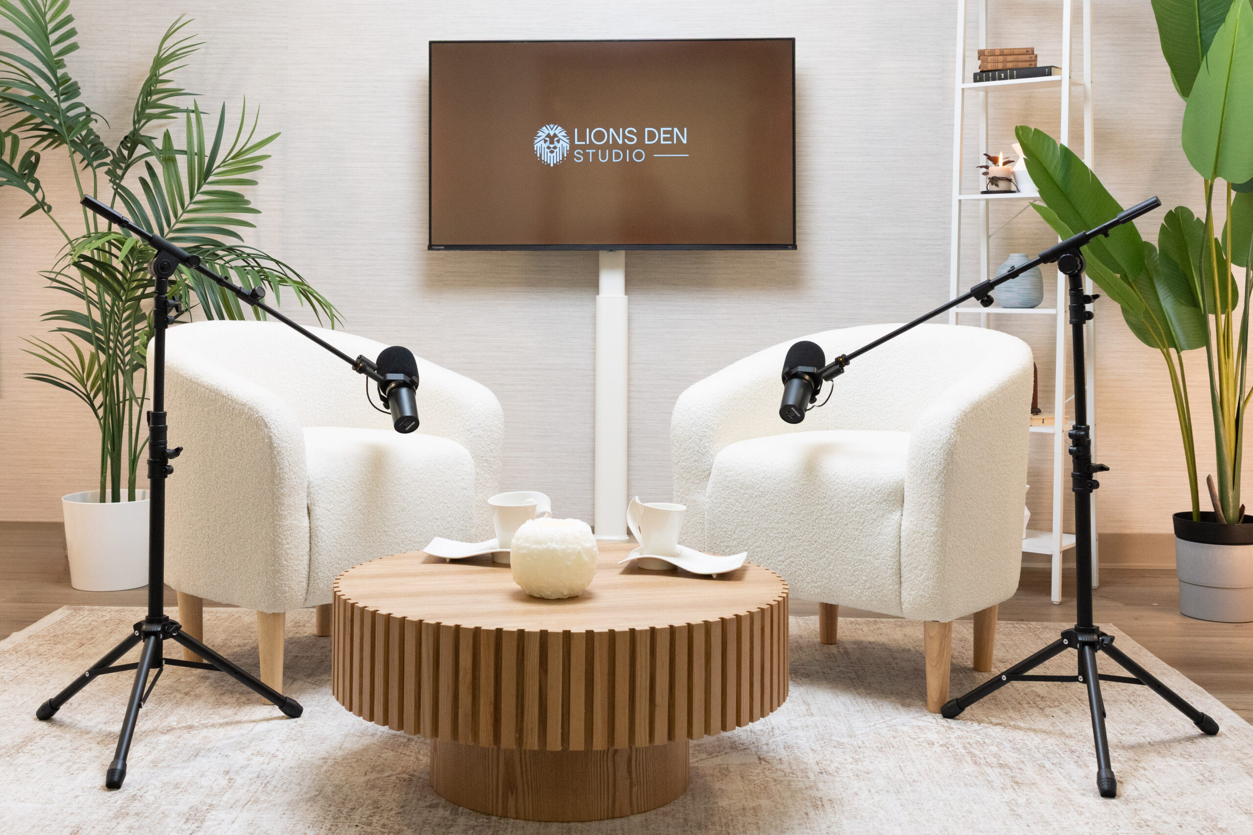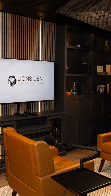 The space is thoughtfully styled with modular, interchangeable furniture for 1-3 guests, allowing you to tailor the layout to your vision — from intimate one-on-one interviews to panel discussions or lifestyle shoots. A sleek mounted display supports custom branding, visuals, or remote guests, while curated décor and subtle accent lighting add depth and polish to your content.